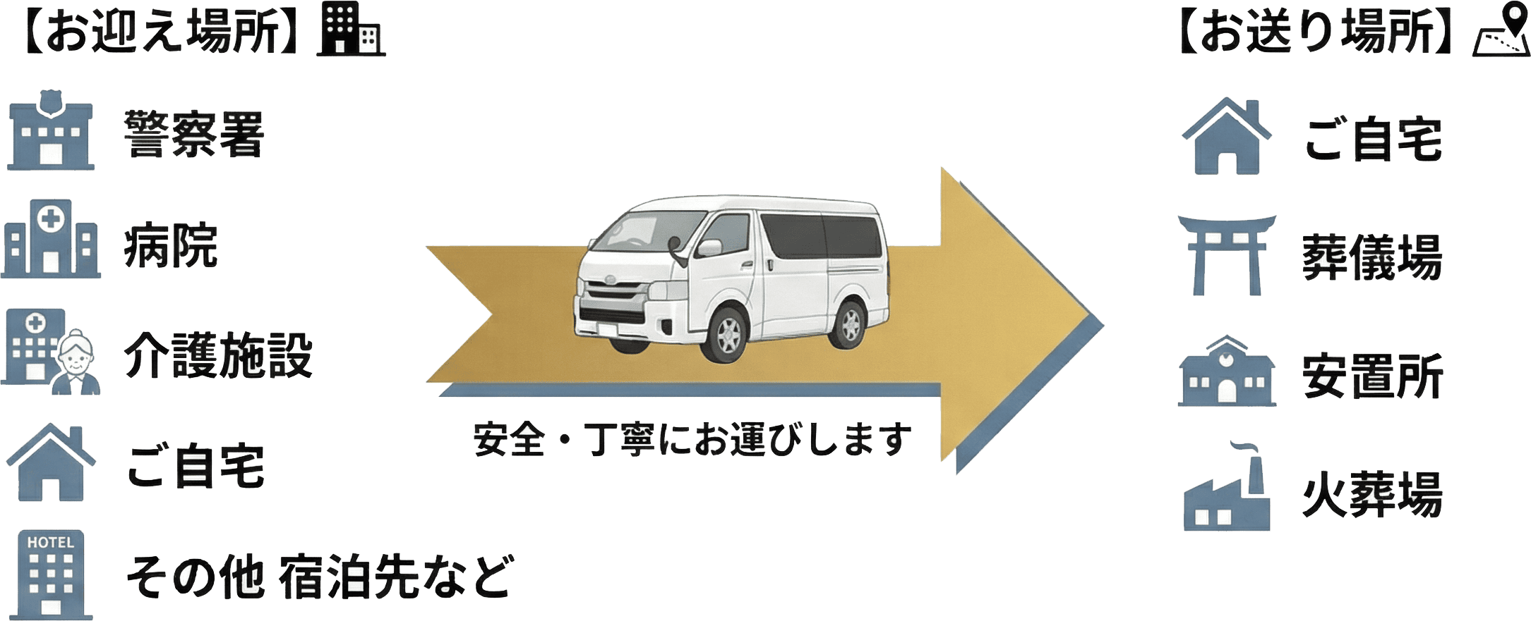 寝台車にて、病院・警察署・施設などご指定の場所へ速やかにお迎えにあがります。